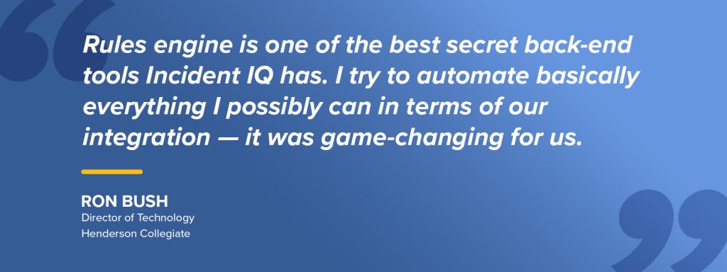 The school heavily leveraged the ability to easily automate everything from help ticket routing and stakeholder follow-up to audit processes with the powerful Rules Engine, saving enormous amounts of time. This freed the IT team up to focus on high-value activities that facilitate uninterrupted student learning. “Rules engine is one of the best secret back-end tools Incident IQ has,” noted Bush. “I try to automate basically everything I possibly can in terms of our integration — it was game-changing for us.”
