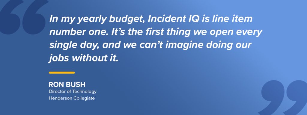 Since onboarding in 2019, the Incident IQ platform has become an integral part of Henderson Collegiate’s operations. “In my yearly budget, Incident IQ is line item number one, “ declared Bush. “It’s the first thing we open every single day, and we can’t imagine doing our jobs without it.”