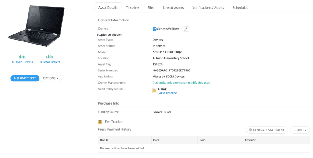 MDM integrations: MDM (mobile device management) integrations for leading platforms such as Google Admin Console, Microsoft SCCM, Jamf, Mosyle Manager, and more allow for real-time data syncs between platforms. This data makes it easier for K-12 IT teams to view recent login data, quickly view system specs, and run actionable reports with school asset management software that can help agents proactively track down missing devices.