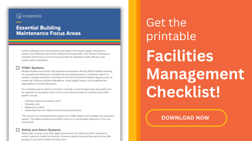 Although routine maintenance may seem like a headache, the process is made easier when you have a digital solution in place for both your facilities and asset management. The facilities management platform from Incident IQ allows you to streamline work orders, schedule recurring tasks for better upkeep, monitor on-site staff performance, conduct risk assessments, and monitor reoccurring problems.Combined, a preventive maintenance checklist and effective facilities maintenance software allow your maintenance team to work more efficiently in creating and executing a proactive building maintenance plan. Schedule a chat with our team to learn how Incident IQ can transform facilities maintenance in your K-12 district.